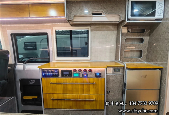 單人座椅后方是中置上客門,在后方是一體式櫥柜,下方帶有儲物抽屜,上方暗藏了一臺家用變頻空調(diào),乘客門上方也提供了多個儲物吊柜,儲物空間充足。櫥柜旁鑲嵌了一臺108L上下雙開門的冰箱,上方則是一臺微波爐,側(cè)面的壁板上還帶有電源插座。