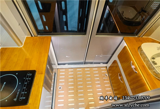 車輛尾部是獨立的廚衛(wèi)區(qū)域,可以通過移門跟生活區(qū)隔開,最大限度的降低油煙干擾和保證衛(wèi)浴間的隱私。后對開門設(shè)計,車內(nèi)布局還可以根據(jù)自己的喜好,個性化定制。