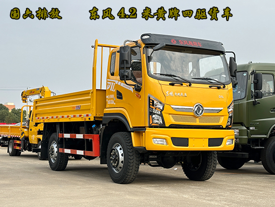 東風黃牌4.2米原廠四驅(qū)貨車,DFV1101GP6D型四驅(qū)載貨汽車,該車驅(qū)動形式為4×4全輪驅(qū)動,采用東風牌DFV5101TGP6DJ型特種作業(yè)底盤,采用東風D1L一排半駕駛室?guī)г瓘S空調(diào),4×4驅(qū)動,選裝玉柴YCY30170-60和玉柴YCS04180-60發(fā)動機,韶齒五檔變速箱,杭齒450分動箱帶高低擋,分時四驅(qū),軸距:3500mm,295/80R22.5越野輪胎,4T前橋,8T后橋,電動玻璃,方向助力,斷氣剎,帶ABS。車廂長4.2米,整車長6.05米,接近角33度,離去角17度,最小離地間隙35公分,涉水深度0.8米。