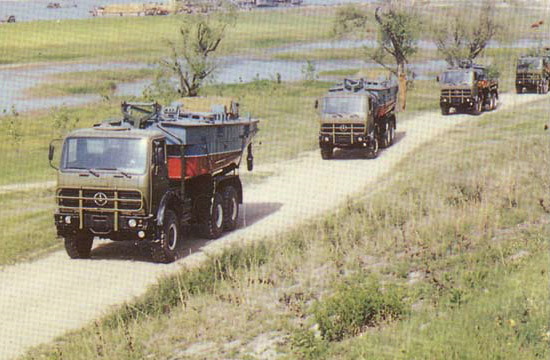 鐵馬XC2200重載卡車在1980年后期進入PLA服役,主要用于運輸重型工程設(shè)備和武器系統(tǒng)。中國鐵馬(Tiema) XC2200重載卡車由西南汽車廠(現(xiàn)在北方- 奔馳卡車公司分部)制造,位于重慶(Chongqing)市?ㄜ囈缘聡焚惖滤-奔馳2060型卡車為基礎(chǔ)。目前卡車在PLA服役中,被當(dāng)做重型工程設(shè)備卡車和武器系統(tǒng)車底盤。PLA在1970年后期訂購了少量的德國梅賽德斯-奔馳2026型重載卡車(8噸的容量,6X6)補充它不足的重載卡車。這些卡車主要地用于重型火炮拖車任務(wù)。PLA對車輛的性能印象深刻,并且接洽梅賽德斯- 奔馳公司去得到許可在中國聯(lián)合生產(chǎn)卡車。鐵馬XC2200(最初即是TM-SC2030)的發(fā)展,梅賽德斯- 奔馳2060型的一個中國仿造型,從1980年早期開始。 西南汽車廠,一個中國北方工業(yè)總公司(NORINCO)位于重慶(Chongqing)市的下屬公司,被選擇當(dāng)做主承包商。1982年看到了原型的介紹。稍后在1985年中國從西德引進了ZF機械變速箱和KHD413風(fēng)冷柴油發(fā)動機技術(shù),兩者在鐵馬XC2200卡車上被采用。XC2200批量生產(chǎn)在1986年開始,每年從生產(chǎn)線上生產(chǎn)2,000輛。大多數(shù)的這些車輛被PLA接收用于重貨物/設(shè)備運輸、火炮拖車和武器系統(tǒng)車底盤。車輛包括在西藏高地、戈壁沙漠和中國最惡劣的道路和天氣狀況區(qū)域展示了優(yōu)良性能和可靠性。除了被PLA部署,車輛也被輸出到巴基斯坦、泰國、印尼和斯里蘭卡。XC2200采用雙車門正向控制駕駛室,位于發(fā)動機艙上面。駕駛室有四個座位和在頂板有一個天窗。后面的貨物車身的后擋板和側(cè)擋板可放下,可拆卸蓬架和帆布蓬。單預(yù)備輪被垂直地安裝在乘員室后面,靠近載貨車箱在駕駛室和后貨物車體之間。這一個空間能用來容納一個修理工具箱和其它的裝載/卸貨設(shè)備。與第一代中國自行生產(chǎn)的重型臺車相比較,XC2200有好很多的通用性能,連同85公里/小時的最大道路速度和一個8噸的越野裝載能力。ZF5S-110/111 GPA變速箱有九個前進檔和一個倒車檔。三個車軸和六個車輪全部運行使用速度差速器鎖定裝置,即使當(dāng)車輛的一側(cè)上一個或更多的車輪沒有與地面接觸中,或已經(jīng)失去牽引,確保車輛持續(xù)驅(qū)動。除了基本的貨物卡車改型之外,XC2200也可得到許多其它的改型, 包括4X4、8X8、長軸距貨車、起重機、掩護所、架橋車、運船車、道路鋪設(shè)車和多種武器系統(tǒng)車底盤。中國也已經(jīng)發(fā)展基于XC2200設(shè)計的WZ551輪式裝甲人員輸送車(APC)。鐵馬XC2200浮橋架橋卡車。鐵馬XC2200用于WS-1多管火箭發(fā)射裝置車底盤。鐵馬XC2200用于運船車。