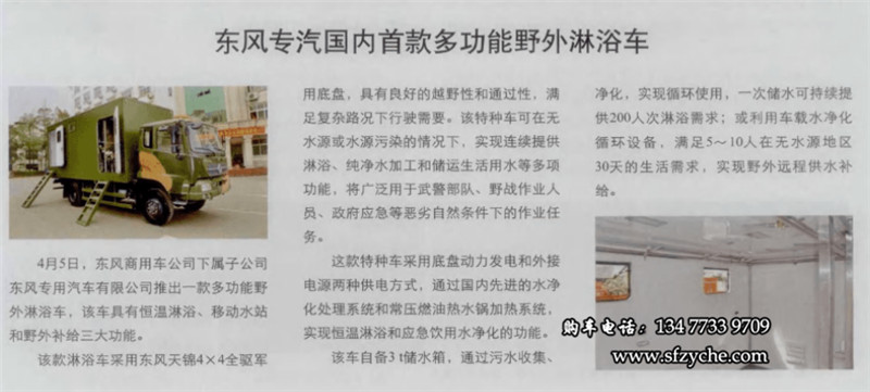東風(fēng)專汽推出國(guó)內(nèi)首款東風(fēng)四驅(qū)多功能野外淋浴車(chē),作為國(guó)內(nèi)首款可在無(wú)水源或水源污染的情況下,實(shí)現(xiàn)連續(xù)提供淋浴、純凈水加工和儲(chǔ)運(yùn)生活用水的多功能特種車(chē),該車(chē)型可完全滿足武警部隊(duì)、野戰(zhàn)作業(yè)人員、政府應(yīng)急等方面需要。它可以連續(xù)提供淋浴、純凈水加工和儲(chǔ)運(yùn)生活用水。據(jù)悉,東風(fēng)四驅(qū)多功能野外淋浴車(chē)可滿足復(fù)雜路況下行駛需要,并具備恒溫淋浴、移動(dòng)水站和野外補(bǔ)給三大功能,可滿足武警部隊(duì)、野戰(zhàn)作業(yè)人員、政府應(yīng)急等方面的需要。該款淋浴車(chē)采用東風(fēng)天錦4x4全驅(qū)軍用底盤(pán),具有良好的越野性和通過(guò)性,可滿足復(fù)雜路況下行駛需要。該車(chē)采用底盤(pán)動(dòng)力發(fā)電和外接電源兩種供電方式,通過(guò)國(guó)內(nèi)先進(jìn)的水凈化處理系統(tǒng)和常壓燃油熱水鍋加熱系統(tǒng),可實(shí)現(xiàn)恒溫淋浴和應(yīng)急飲用水凈化。通過(guò)自動(dòng)化柴油鍋爐,實(shí)現(xiàn)15分鐘加熱至42°C,同時(shí)滿足8人淋浴需求。淋浴間采用復(fù)合保溫板制作,有效提高車(chē)廂內(nèi)部保溫性能。淋浴噴頭采用紅外線感應(yīng)控制,有效提升使用效率和節(jié)水要求。淋浴間內(nèi)還加裝LED照明燈、換氣扇、折疊式坐凳等輔助設(shè)備。