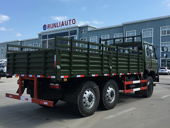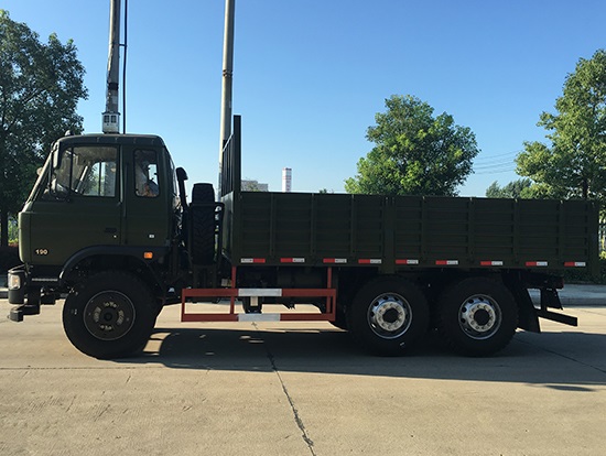 東風(fēng)新款國五六驅(qū)越野貨車配置簡介:采用東風(fēng)EQ2220GD5DJ型越野汽車底盤,東風(fēng)D530老款駕駛室/D913豪華駕駛室可供選裝,6×6驅(qū)動,康明斯ISB190 50國五發(fā)動機,六檔變速箱,標(biāo)配315/80R22.5 20PR可換為12.5R20真空越野輪胎,軸距3500+1250mm,加厚雙層大梁,電動玻璃,方向助力,斷氣剎,ABS,備胎一套,大箱長度5米,墻板高度600mm。