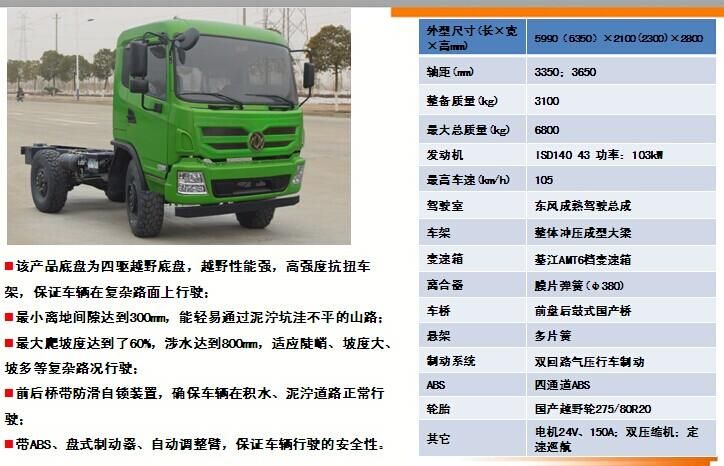 相關(guān)車型EQ2070GZ4DJ越野四驅(qū)底盤的詳細(xì)描述:該產(chǎn)品底盤為四驅(qū)越野底盤,越野性能強(qiáng),高強(qiáng)度抗扭車架,保證車輛在復(fù)雜路面上行駛時(shí),不會出現(xiàn)大梁斷裂等情況;最小離地間隙達(dá)到300mm,能輕易通過泥濘坑洼不平的山路;最大爬坡度達(dá)到了60%,適應(yīng)陡峭、坡度大、坡多等復(fù)雜路況行駛。前后橋帶防滑自鎖裝置,確保車輛在積水、泥濘道路正常行駛;帶ABS、盤式制動器、自動調(diào)整臂,保證車輛行駛的安全性。