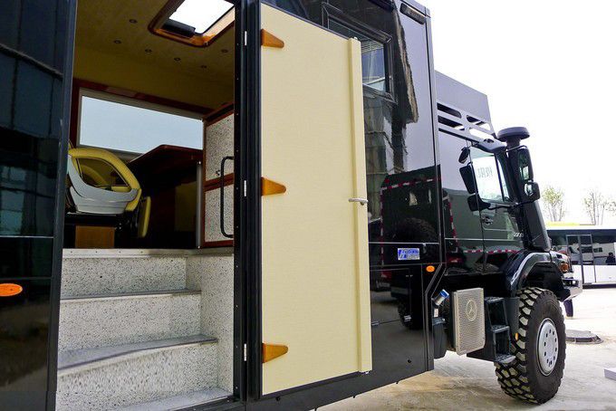 六驅(qū)越野房車底盤配置:Zetros6×6采用了14.00 R20的鋼制越野輪胎,如果用戶認(rèn)為這款輪胎尺寸太大,那么奔馳還提供小尺寸的10.00 R20輪胎選裝。對于要求個(gè)性化的用戶,奔馳還為Zetros的輪胎準(zhǔn)備了拋光的輪轂罩。Zetros雖然沒有采用烏尼莫克的招牌門式橋結(jié)構(gòu),但其前后的拋物線鋼板彈簧依然能夠保證越野時(shí)的車身承重與舒適性。這款車前后車橋都是輪邊減速橋,后橋速比為4.833。此外其前橋軸間承載極限是9噸,后橋則為18噸,整車最大總重為27噸,匹配全時(shí)6驅(qū)和輪胎充放氣系統(tǒng)成就了它重載越野之王的稱號。一副正統(tǒng)卡車駕駛席的模樣,殊不知后排有著超豪華的裝潢。德國沃爾特工廠的精細(xì)裝配工藝在這輛卡車上仍然可以體現(xiàn)出來,主副駕駛席氣墊座椅、可加熱電動(dòng)外后視鏡也都是標(biāo)配。Zetros的心臟目前只有一臺7.2升的奔馳OM 926LA直列6缸渦輪增壓柴油發(fā)動(dòng)機(jī),采用的SCR技術(shù)可以讓其達(dá)到歐5排放標(biāo)準(zhǔn),最大馬力為326馬力,最大扭矩則為1300牛米。變速箱采用的是奔馳公司的G 131型9擋手動(dòng)變速箱,對于特殊需求的用戶,Zetros也可以選裝自動(dòng)變速箱。在控制面板上你可以很輕松的找到相應(yīng)功能的控制按鈕,圖中中間部分最右側(cè)的是一個(gè)上坡攀爬系統(tǒng)旋鈕,其功效與低扭放大作用一樣,之后向左的第二個(gè)旋鈕可控制三軸之間差速鎖的開合,其形式與奔馳G63AMG 6×6的控制原理一致,三個(gè)擋位控制五把鎖 。
