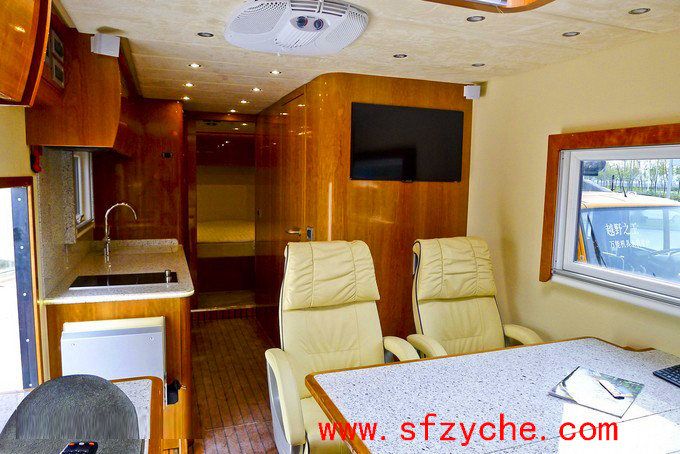 六驅(qū)越野房車車身內(nèi)整體豪華配置:在駕駛室中還有主流卡車中配備的天窗通風(fēng)系統(tǒng)和后排折疊床板,這款越野房車的后排內(nèi)部具有地板加熱系統(tǒng),獨(dú)立的會客廳,高級絨布真皮座椅具備多項(xiàng)可調(diào)功能,雖然包裹感不是很強(qiáng),但卻有一定的支撐性,更加符合越野房車的特質(zhì)。此外,中央空調(diào)、天窗與側(cè)窗外加頂部迎賓燈的點(diǎn)綴是恰到好處,前后對著的兩臺大尺寸液晶電視方面中央四位乘客觀看。在門口的兩側(cè),分別是吧臺和迷你廚房,電磁爐、微波爐、冰箱應(yīng)有盡有。車門頂部設(shè)有整車電路控制面板,可通過開關(guān)控制燈光、車門等等。干濕分離的衛(wèi)生間分別分布在客廳旁與臥室中,其中一間設(shè)有浴盆和真空馬桶,另一間則配有恒溫淋浴,走廊的盡頭就是這間臥室,其擁有電控臥室門,獨(dú)立中央空調(diào)、屋內(nèi)整體照明系統(tǒng)與液晶電視,此外整間臥室采用了實(shí)木裝潢,超寬的雙人床鋪?zhàn)銐蜍囍飨碛谩?/span>