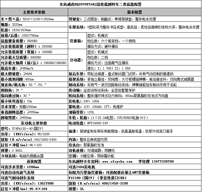 東風(fēng)EQ2070FFZ4D型高性能越野特種車是一款技術(shù)先進(jìn)、性能卓越、多功能、全天候的特種越野車,也是中國上唯一在沙漠、山區(qū)等極其艱苦環(huán)境條件下顯示高技術(shù)、高性能和高可靠性的軍用和特殊民用汽車。該產(chǎn)品,無論是越高山峻嶺、穿林海雪原,還是闖茫茫沙漠、涉沼澤泥潭,無論是用作防彈運(yùn)兵、戰(zhàn)地救護(hù),還是用作森林消防和野外勘探,它都能以超一流的越野通過能力、高涉水性,可靠耐久性和優(yōu)異的上裝適用能力,令世人嘆為觀止,當(dāng)之無愧地成為挑戰(zhàn)越野極限的明星。如需了解更多EQ2070FZ4D型越野四驅(qū)汽車的詳細(xì)參數(shù)和配置請立即撥打銷售熱線:13477339709 李經(jīng)理 0722-7053060 業(yè)務(wù)QQ:530233927,微信號:13477339709 ,東風(fēng)越野卡車網(wǎng)址:m.kfjy68.com