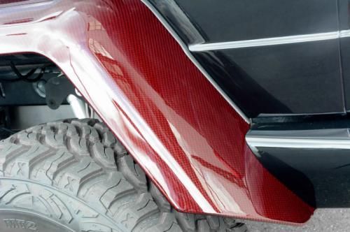 第一眼看去,這輛G63 AMG 6x6的涂裝會讓人感覺有些怪異。的確,這輛Brabus出品的六輪怪獸換上了紅色碳纖維車身改裝件,后視鏡蓋、輪眉以及引擎蓋都采用了紅色碳纖維材料。透過車窗我們能看到內(nèi)飾同樣是紅色主題,甚至是輪圈內(nèi)也有紅色點綴。