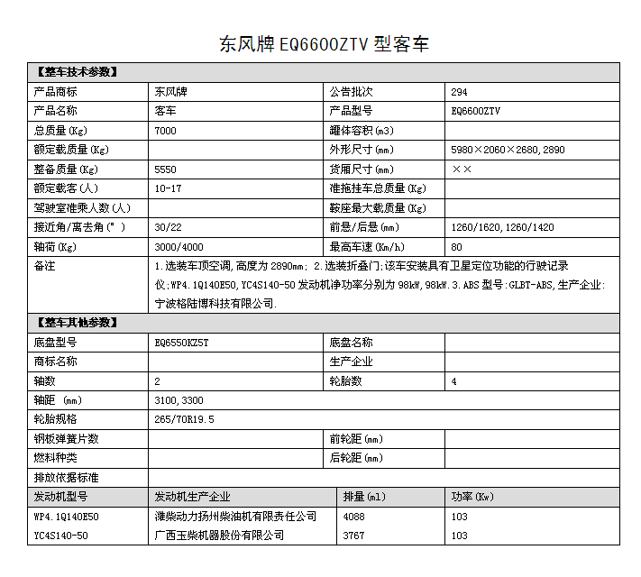 EQ6600ZTV四驅(qū)越野客車圖片,國五排放四驅(qū)10座越野客車價格,6米四驅(qū)客車多少錢,東風(fēng)四驅(qū)越野客車參數(shù)配置: 1.底盤型號EQ6550KZ5T,發(fā)動機型號:YC4S140 50 國五排放 2.整車外形尺寸長寬高:(5980×2060×2890)mm 驅(qū)動形式:4×4 東風(fēng)分時四驅(qū) 3.離合助力,方向助力,斷氣剎,鼓式自動,駕駛區(qū)域空調(diào) 4.車橋為東風(fēng)德納,輪胎為265/70R19.5型越野輪胎,ABS 5.工具箱,前置防裝杠,粘接式推拉玻璃,發(fā)動機底板防護 6.鋁花紋地板,中檔皮革座椅10個+1個折疊座椅,整車座椅安全帶,手動式外擺門,正副司機門,后置雙開門,東風(fēng)原廠派恩頂置空調(diào) , 7.窗簾,滅火器兩個,備胎一個,獨立燃油暖風(fēng)系統(tǒng)帶兩個雙面王出風(fēng)口 8.其它為EQ6600ZTV型四驅(qū)越野客車標(biāo)配。具體配置參數(shù)參照(附件一)。 成品合格證、全額上戶發(fā)票、隨車工具、隨車文件各一套。