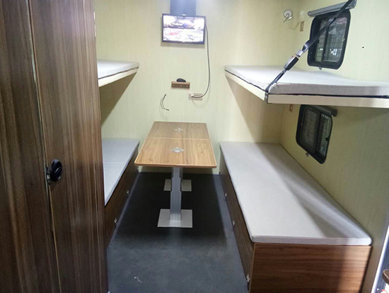 東風大型四驅(qū)越野房車滿足更多路況復(fù)雜環(huán)境使用,廂體內(nèi)裝有豪華折疊床、液晶電視、儲物柜、應(yīng)急燈、頂燈、頂置空調(diào)、床墊、被褥、燃油加熱器、頂護欄、爬梯、隱藏抽拉梯、專用房車門、中空玻璃、戶外燈。由保溫廂體、空氣調(diào)節(jié)系統(tǒng)、宿營設(shè)施、影音系統(tǒng)、電氣系統(tǒng)、通風換氣系統(tǒng)、洗漱和衛(wèi)生設(shè)施。整個廂體分為三個部分,住宿區(qū)、洗漱區(qū)、餐飲區(qū)。住宿區(qū)包括四個上下鋪,床頭燈,液晶電視,空調(diào)等。洗浴區(qū)包括臉臺,衛(wèi)生間,熱水器等。餐飲區(qū)包括無煙灶臺,可活動餐桌,洗菜盆等。也可以根據(jù)用戶的需要設(shè)計,可增加會議室,辦公區(qū)等。東風大型四驅(qū)越野房車內(nèi)飾圖片: